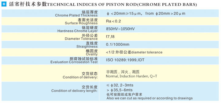 本產(chǎn)品表面經(jīng)特殊研磨及硬鉻電鍍技術外理,再經(jīng)鏡面拋光而成,具有耐磨擦、抗腐蝕性特性,可用作各種氣缸、油缸、包裝機械、木工機械、紡織機械、印染機械、壓鑄機、注塑機及其它機械的導桿、頂桿。