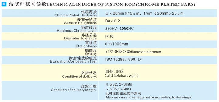 本產(chǎn)品表面經(jīng)特殊研磨及硬鉻電鍍技術(shù)外理,再經(jīng)鏡面拋光而成,具有耐磨擦、抗腐蝕性特性,可用作各種氣缸、油缸、包裝機(jī)械、木工機(jī)械、紡織機(jī)械、印染機(jī)械、壓鑄機(jī)、注塑機(jī)及其它機(jī)械的導(dǎo)桿、頂桿。